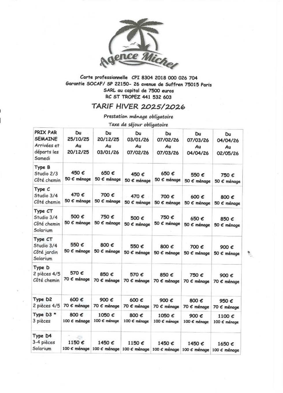 Appartement 2 pièces de 46 m2 avec une terrasse vue jardin et piscine. 2ème étage. Appartement rénové et climatisé avec un séjour, un canapé lit 2 personnes, télévision, une cuisine équipée, lave-vaisselle et lave-linge, une chambre séparée avec 2 lits twin, une salle de douches avec WC séparés. WIFI. Résidence avec piscine et parking privatif. 05 minutes à pied du centre-ville de Saint-Tropez. Forfait ménage obligatoire. Taxe de séjour obligatoire. Numéro mairie : 83119002216AK.